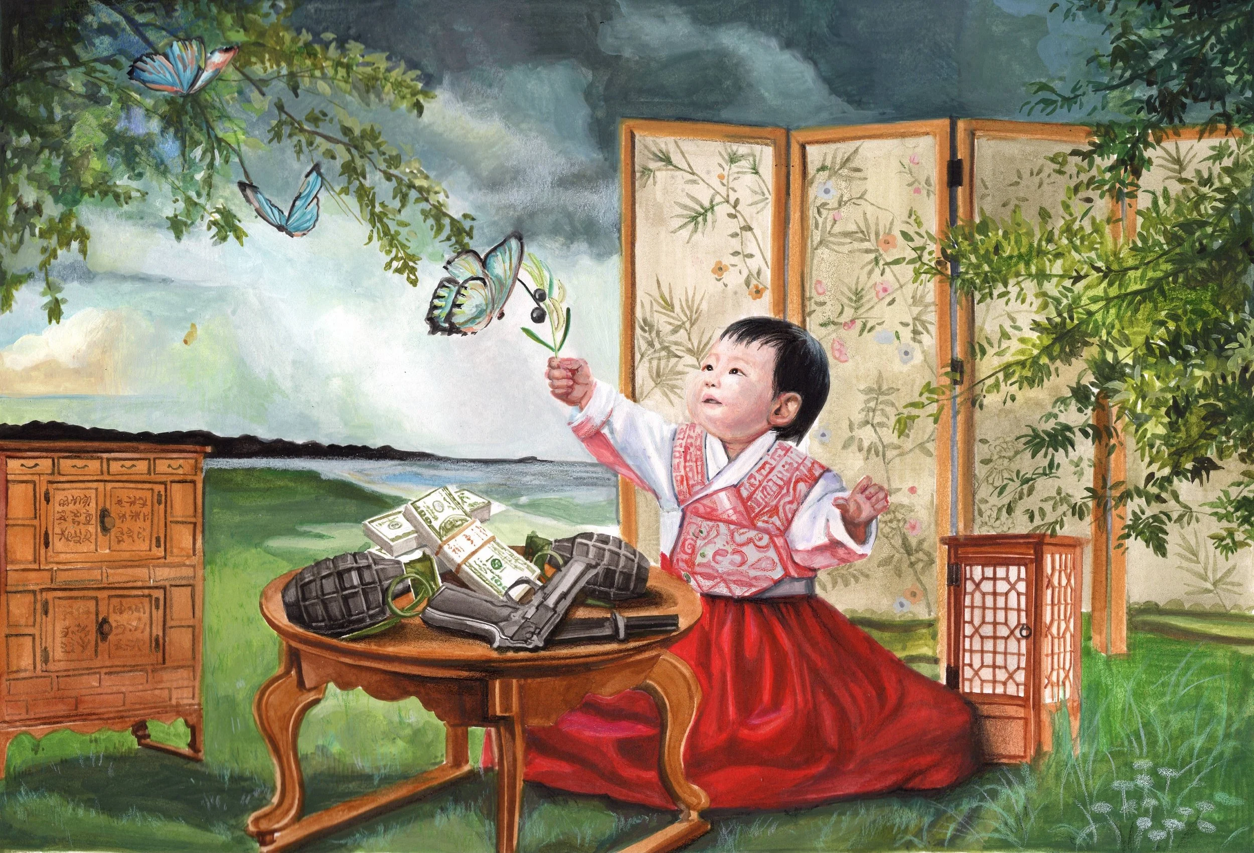 O princípio desta obra reside no seu fulgor subentendido, presente nas entrelinhas da apatia e da vigarice. Ao longo da composição, é possível observar a perspectiva da figura superior. Ela é o sistema, uma ordem superior que tende a reprimir a inovação. Este oprime, de forma discreta, a tentativa da reforma do pensar. Coloquei, sobre a quebra da suposta paz, uma flor. Aos olhos do indivíduo que suprime, está será eternamente a flor mais formosa que já vira, todavia, à pessoa inferior,